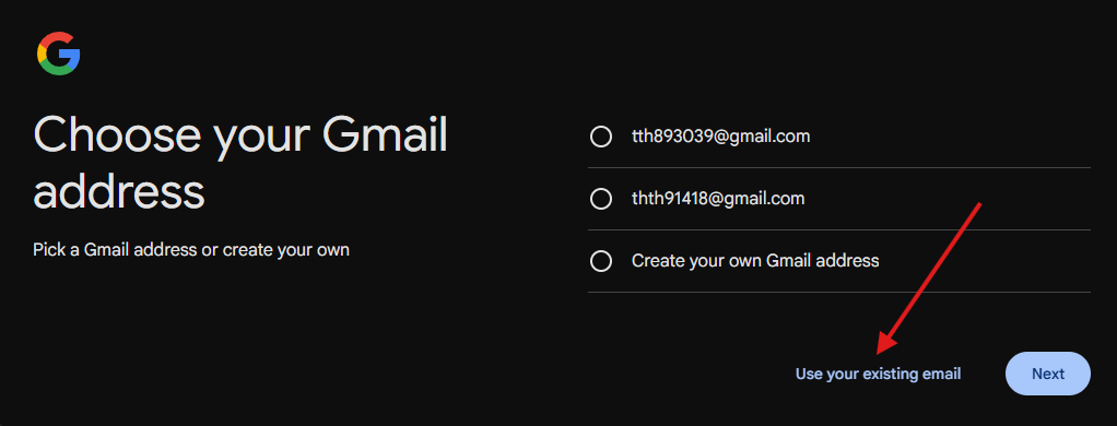 When prompted to choose your Gmail address, do not select or create a new Gmail address.